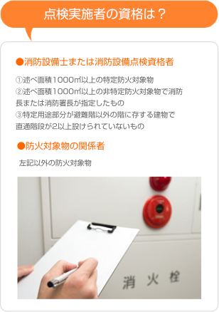 特殊消防用設備等の点検は、設備等設置維持計画に定める点検の期間ごとに適合しているかどうかについて点検資格を有する消防設備士又は消防設備点検資格者に点検してもらいます(報告する人は、防火対象物の関係者です)