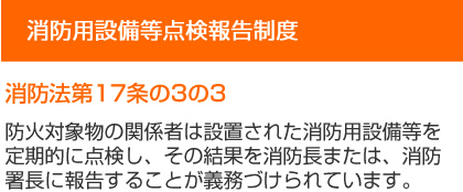 防火対象物の関係者(所有者・管理者・占有者)は設置された消防用設備等を定期的に点検し、その結果を消防長又は消防署長に報告することが義務付けられています。